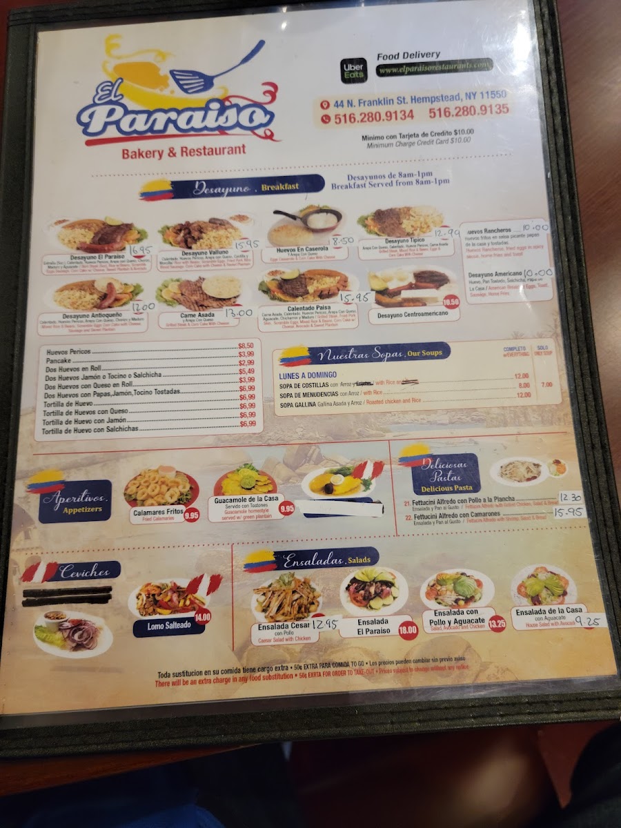 El Paraiso Restaurant offers an authentic taste of Colombian and Latin American cuisine right in Hempstead, NY. The menu is a delightful journey through traditional flavors, anchored by their famous empanadas de trigo, with fillings ranging from spinach and cheese to classic beef and chicken. These golden, crisp patties are a true standout and a must-try. For hearty main courses, their chicken dishes impress—options like pechuga a la jardinera and arroz con pollo showcase well-seasoned, tender proteins paired with familiar sides such as rice, beans, and sweet plantains. The blend of textures and vibrant flavors reveal the depth of Colombian culinary heritage. Families will appreciate the kids’ menu, which balances familiar favorites like chicken nuggets and sausage combos with generous portions. Friendly service enhances the experience, creating a welcoming atmosphere. El Paraiso shines as a go-to spot for rich, comforting meals that honor traditional recipes with fresh ingredients. It is a true culinary haven for Latin American food enthusiasts.